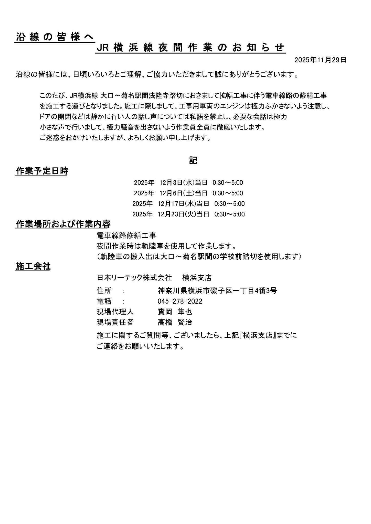 JR横浜線法隆寺踏切り拡幅工事の12月度のお知らせ